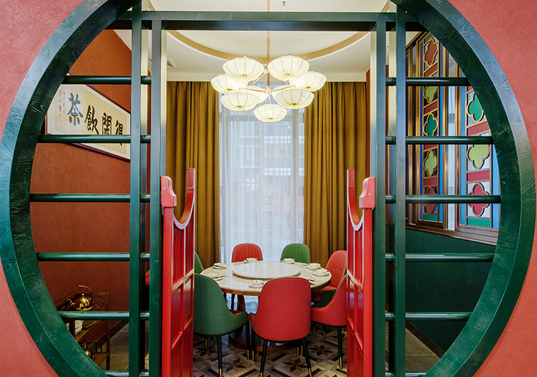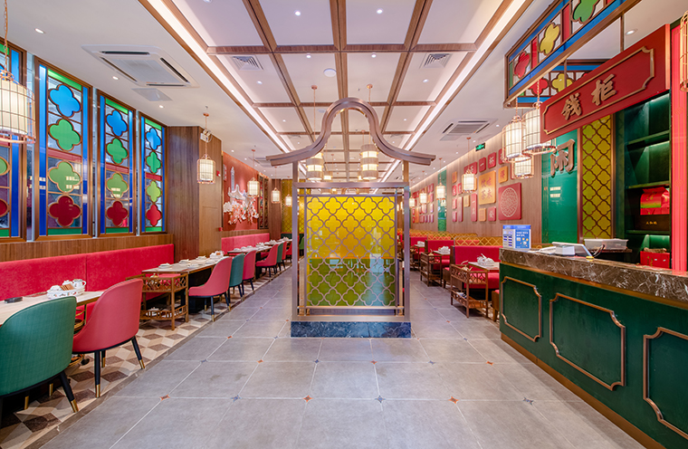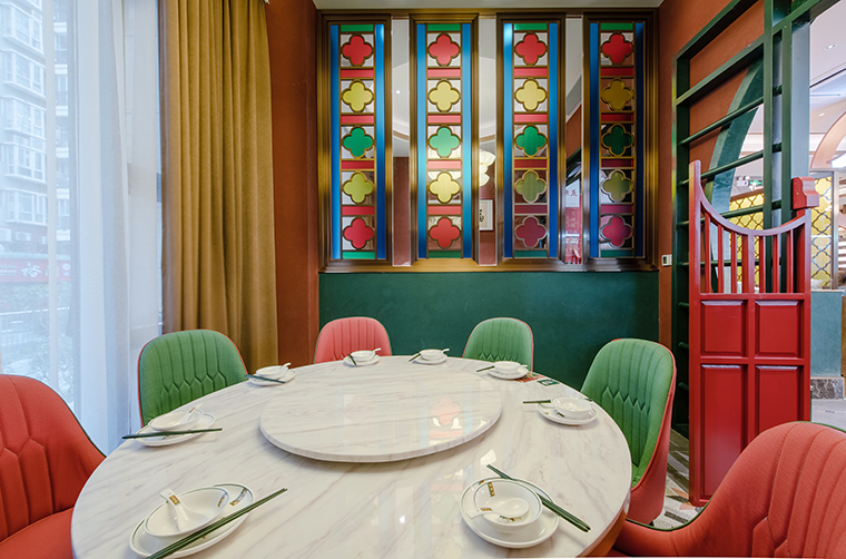 中,我們將廣式花窗大面積使用在正面形象,進門口,包房隔斷等,形成了強烈的視覺沖擊力,具有鮮明的品牌感。