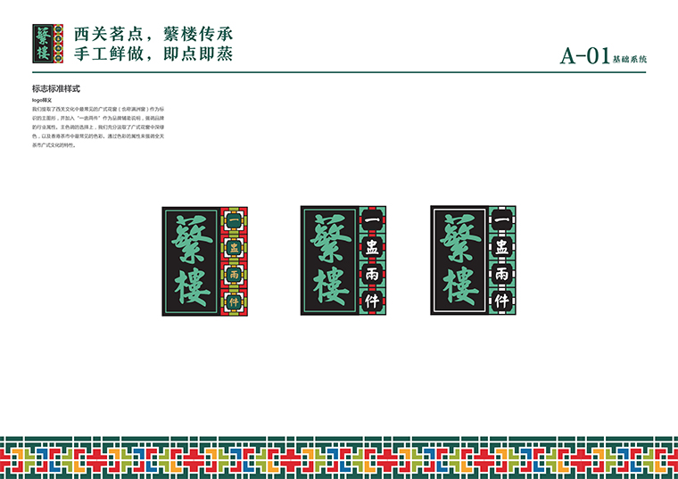 蘩樓兩個字在日常中很少看見,認識的人不多,但是一旦認識了,識別度非常高。品深設計方法論認為:優秀的標識logo首先應該傳達品牌屬性,其次是承載品牌的文化,再次是很容易識別和傳播。我們提取了西關文化中最常見的廣式花窗(也稱滿洲窗)作為標識的主圖形,并加入“一盅兩件”作為品牌輔助說明,強調品牌的行業屬性。