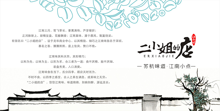有了容易識別的名字,我們還要給她更明確的傳播話語。因為二小姐的店這個名字有了強烈的餐飲品牌屬性,卻沒有明確的特色定位屬性,我們決定在LOGO設計中加入江南味的定位,讓杭幫菜的特性更明確,這樣就有了更明確的品牌定位傳播力了。
