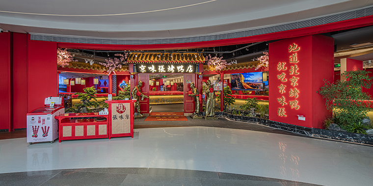 2、里悅里店品牌在空間中體現的比較少,更多通過大面積的中國紅,立面造型則大量使用北京故宮高精度實景照片做成軟膜發光燈箱,效果整體也不錯,但與京味張品牌的關聯度還不夠緊密。