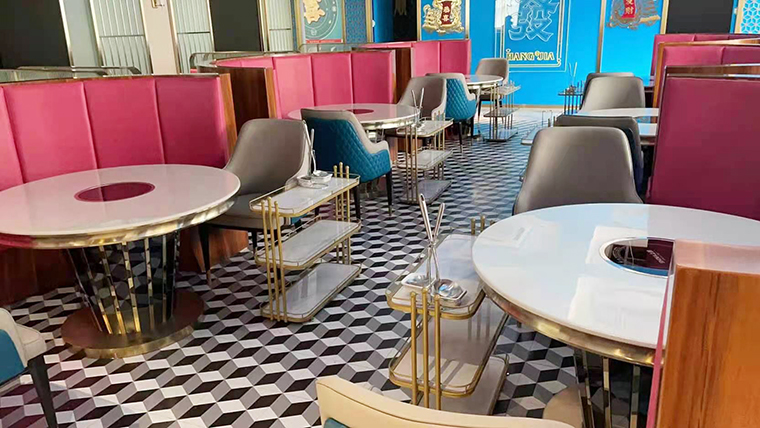 整體氛圍去掉繁雜多余的線條,多用皮質,不銹鋼材質,呈現精致,高品質的用餐氛圍!空間的整體照明燈光以柔和面光為主,餐桌上方局部聚光燈照明,突出火鍋湯底的特色,金黃明亮;特色的吊燈,讓空間層次鮮明,港風濃郁。家具以皮革為主,金屬收邊,加上小屏風讓空間感更通透,能表達出輕奢的質感。